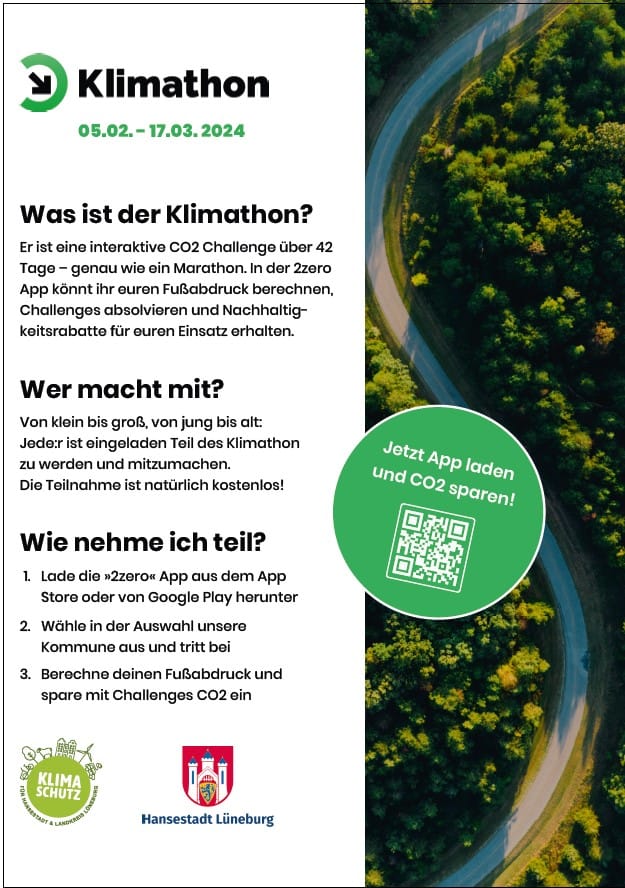 Die Lüneburger:innen haben beim Klimathon vom 05.02.–17.03.24 stolze 27 Tonnen CO₂ eingespart. Dieser Bericht gibt Einblicke in die Motivation der Stadt, den organisatorischen Aufwand, die Zusammenarbeit mit 2zero und die Integration des Klimabonus. Ein tolles Beispiel für gelebten Klimaschutz!